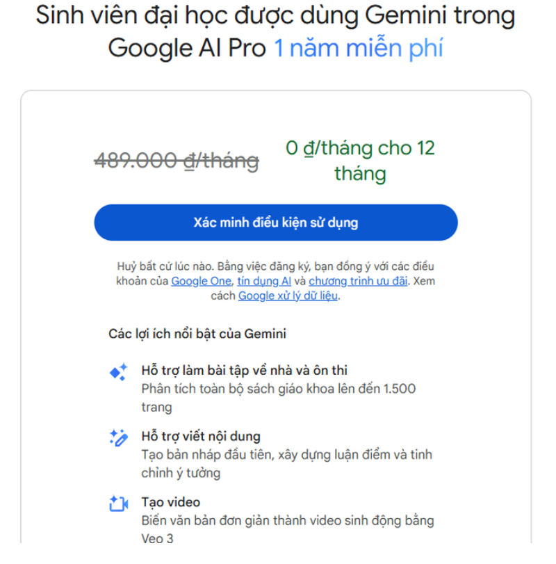 Giao diện đăng ký gói Google AI Pro miễn phí dành cho sinh viên. Ảnh: Chụp màn hình