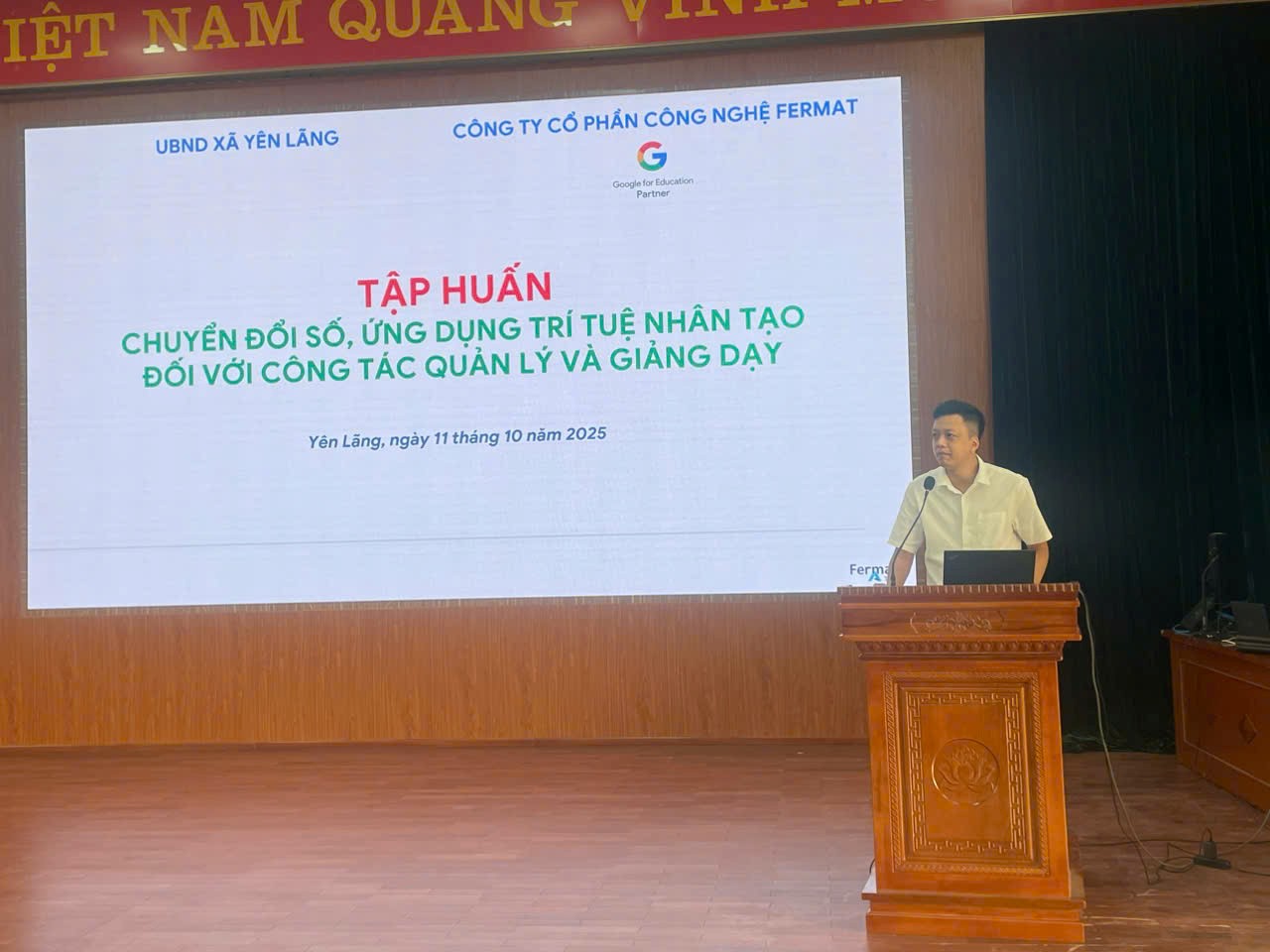 Hưởng ứng Ngày Chuyển đổi số quốc gia 10/10 và thực hiện kế hoạch đẩy mạnh ứng dụng công nghệ số trong giáo dục, vào sáng ngày 11 tháng 10 năm 2025, UBND xã Yên Lãng phối hợp cùng Công ty Cổ phần Công nghệ Fermat tổ chức lớp tập huấn “Chuyển đổi số, ứng dụng trí tuệ nhân tạo (AI) trong công tác quản lý và giảng dạy” cho đội ngũ cán bộ quản lý, giáo viên các trường mầm non, tiểu học và THCS trên địa bàn xã.