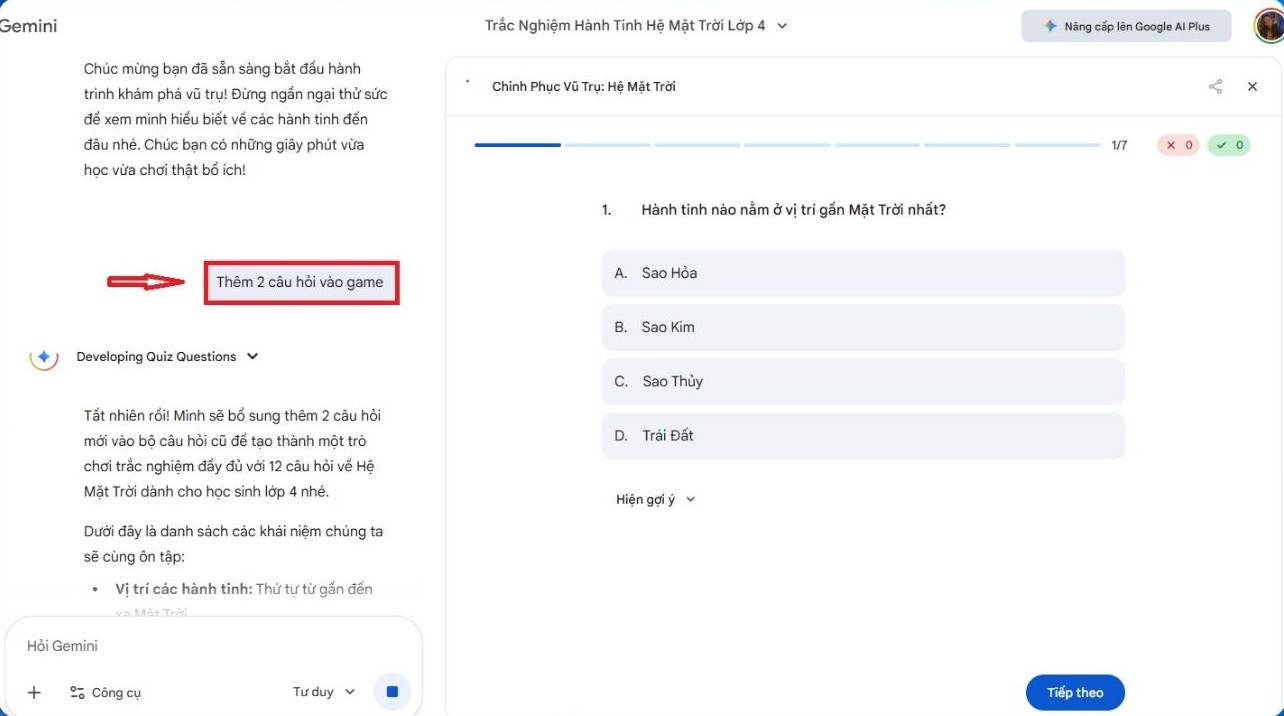 Sau khi Gemini phản hồi, giáo viên có thể yêu cầu AI điều chỉnh độ khó, thêm gợi ý cho từng câu hỏi hoặc bổ sung thêm các câu hỏi mới để phù hợp với thời lượng tiết học. Tính năng này giúp bài kiểm tra trắc nghiệm trở nên trực quan và hấp dẫn hơn.